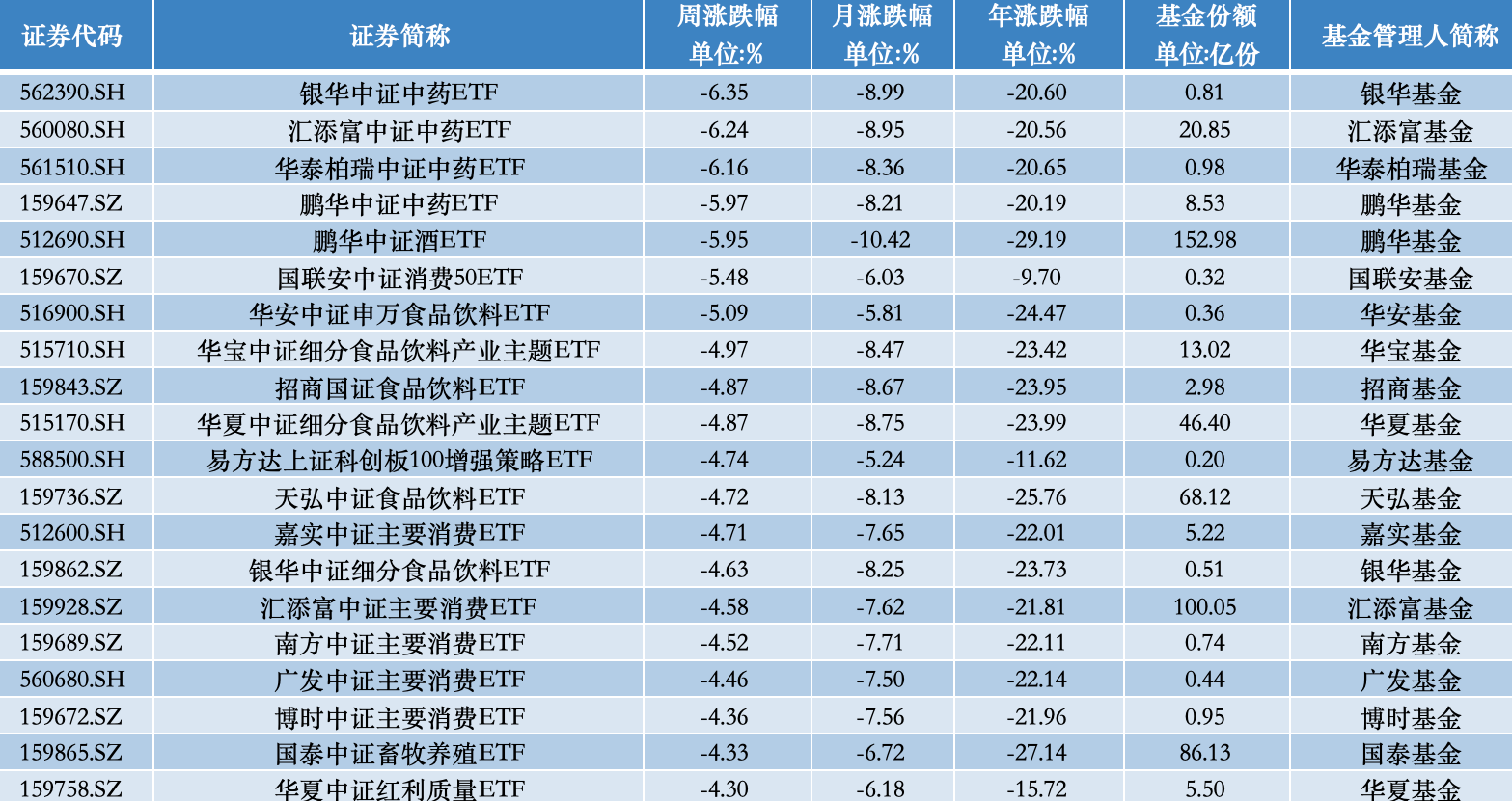 除了中药ETF外,布局白酒股的酒ETF、食品饮料ETF、必选消费ETF等多只产品周跌幅超过4%。个股方面,本周白酒股表现不佳,贵州茅台周五盘中一度跌破1300元整数关,五粮液、泸州老窖、山西汾酒等重要白酒股本周都创出阶段新低。