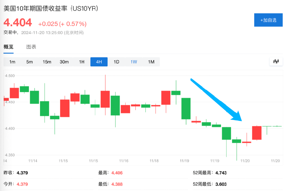 本周一,10年期美债收益率一度跌逾4bp,周二一度跌破4.4%关口,最低报4.37%。