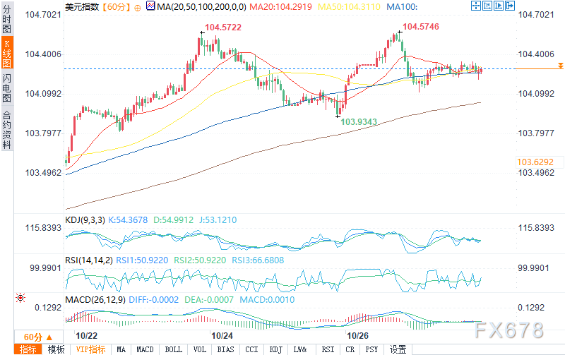 周二(10月29日)欧盘时段,美元面临压力。美元指数在104.2289美元附近徘徊;突破104.350- 104.229美元区间可能决定其下一步走势。