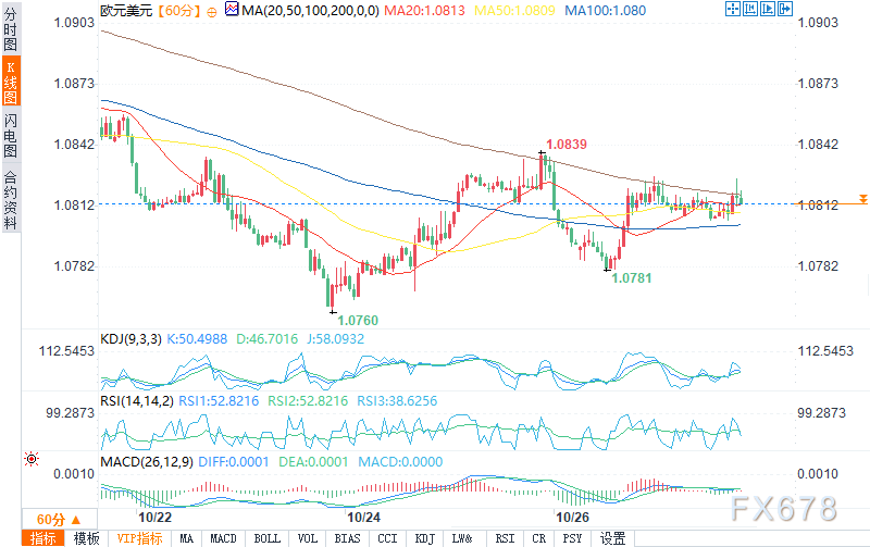 北京时间18:27,美元指数报104.3326/3426,涨幅0.02%。欧元/美元报1.0810/11,跌幅0.01%。英镑/美元报1.2977/78,涨幅0.05%。