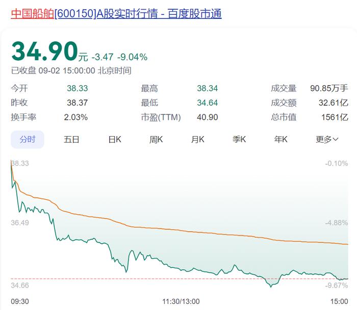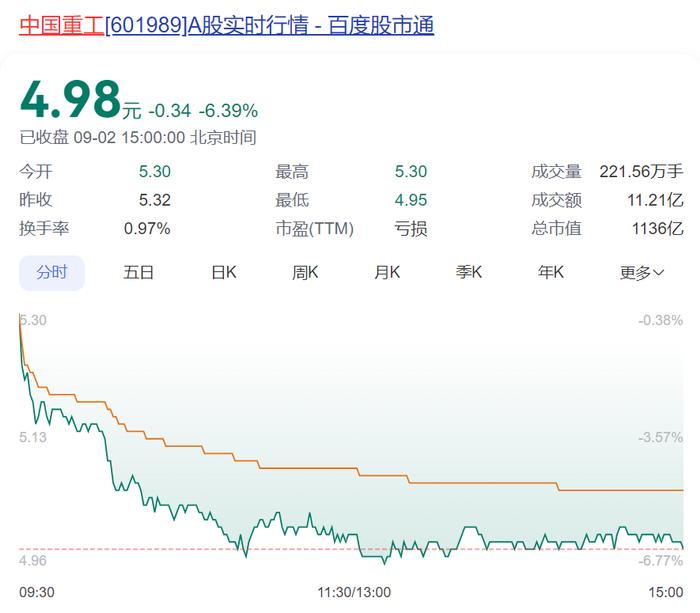 值得一提的是,中国船舶、中国重工9月2日均出现大跌,截至收盘中国船舶大跌超过9%,股价报34.9元,中国重工股价报4.98元,大跌6.39%。