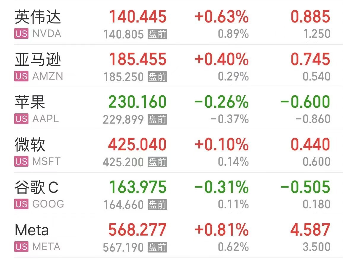 大型科技股涨跌不一,Meta涨0.81%,英伟达涨0.63%,亚马逊涨0.40%,微软涨0.10%,谷歌跌0.31%,苹果跌0.26%。