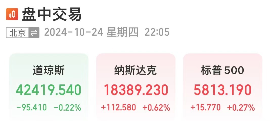 10月24日晚,美股三大指数开盘涨跌不一,道指跌0.22%,纳指涨0.62%,标普500指数涨0.27%。