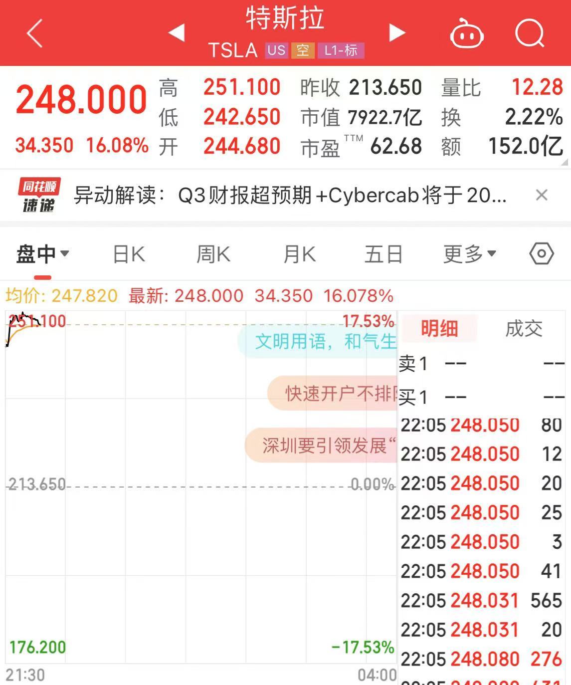 特斯拉股价飙涨16.08%,市值大涨1097.48亿美元(约合人民币7811.66亿元)。