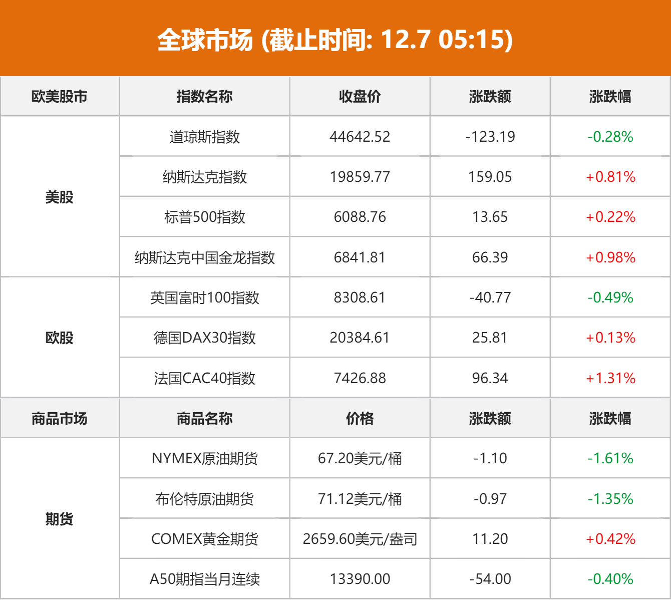 美股市场:美股收盘涨跌不一,纳指与标普500指数再创历史新高,截止收盘,道琼斯工业平均指数比前一交易日下跌123.19点,收于44642.52点,跌幅为0.28%;标准普尔500种股票指数上涨15.16点,收于6090.27点,涨幅为0.25%;纳斯达克综合指数上涨159.05点,收于19859.77点,涨幅为0.81%。本周,道指累跌0.60%,纳指累涨3.34%,标普500指数累涨0.93%。